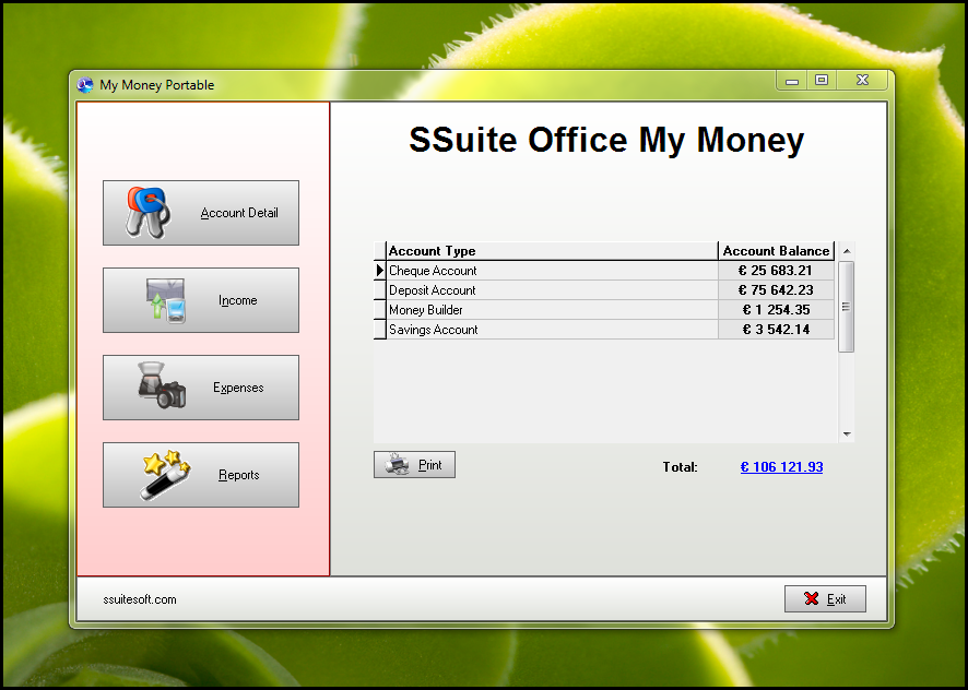 SSuite My Money Portable is a utility that allows users to keep an eye on their accounts, income and expenses, and to generate financial reports.