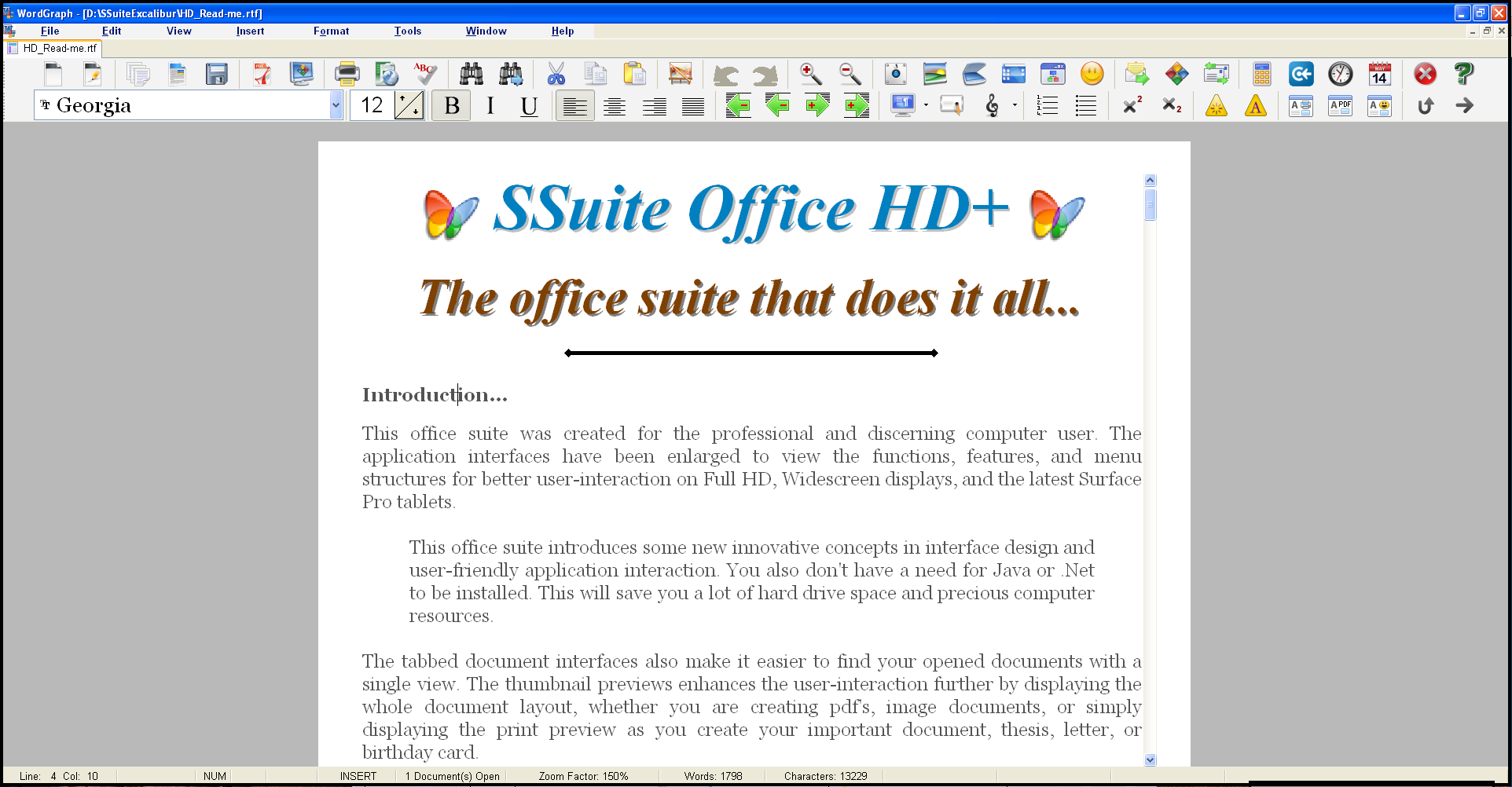A number of available features give you a fine degree of control over the formatting of text, pages, sections of documents, and also entire documents in WordGraph. You may also save your documents in a variety of industry standard formats and even export them to pdf, jpg, bmp, png, gif, and our own presentation format ssp. Document compatibility with MS Office - { rtf, doc, txt, rtc }