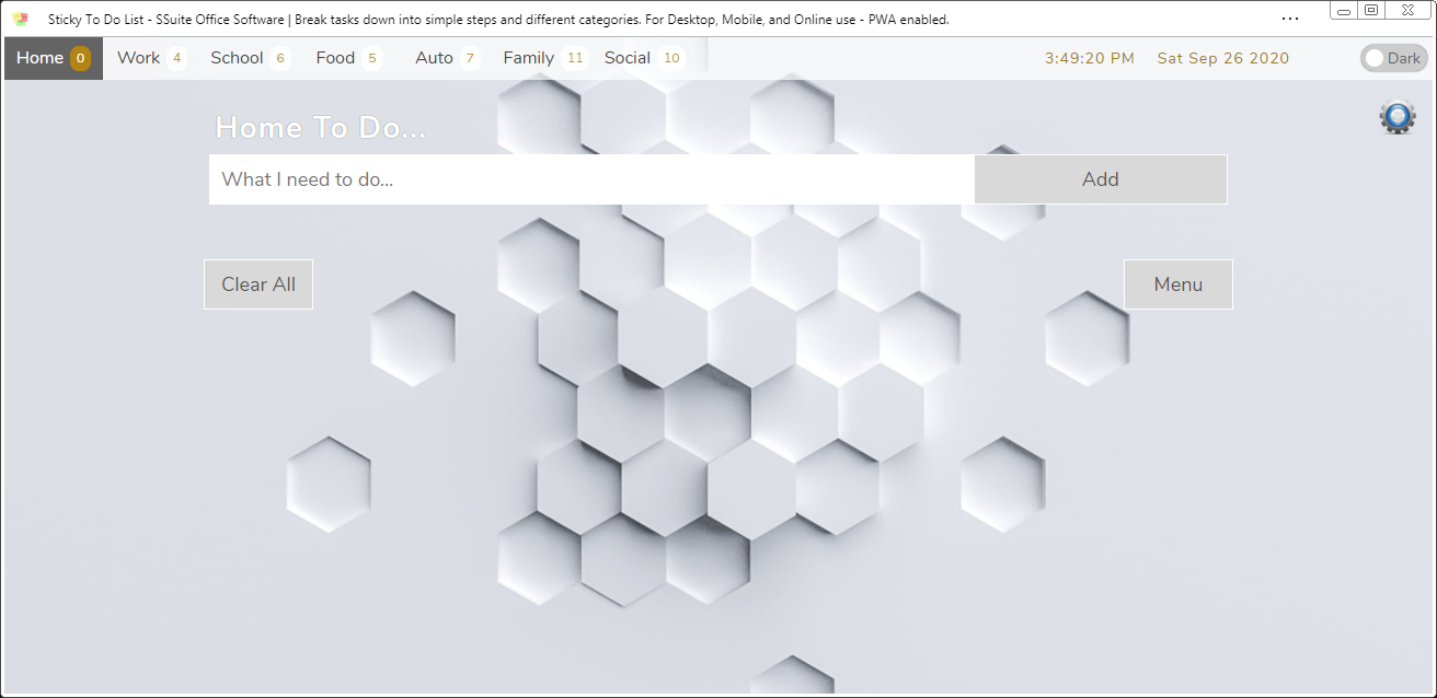 SSuite's Sticky To Do app gives you an easy way to track your tasks and organize your day. Sticky To-Do is an easy way to manage your tasks across all platforms. This simple to use and extremely fast To Do list creator runs on any Operating system platform e.g. iOS, Android, Windows, and Linux, and on any hardware including smartphones, laptops, and desktop computers.